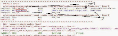 Finally, I will just show what's going on in the .text section, when the "Hello world!" program is executed (loaded in memory). To this, I'm using WinDbg. Note that the "Hello world!" program is linked with the DYNAMICBASE switch, i.e. it's Address Space Layout Randomization (ASLR) compatible.